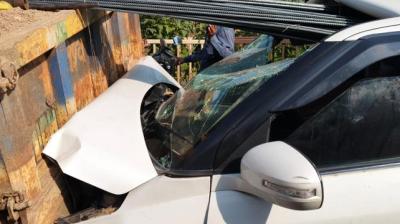 थीम रोड पर बड़ा हादसा टला, ट्रक से गिरीं लोहे की छड़ें कार में धंसीं