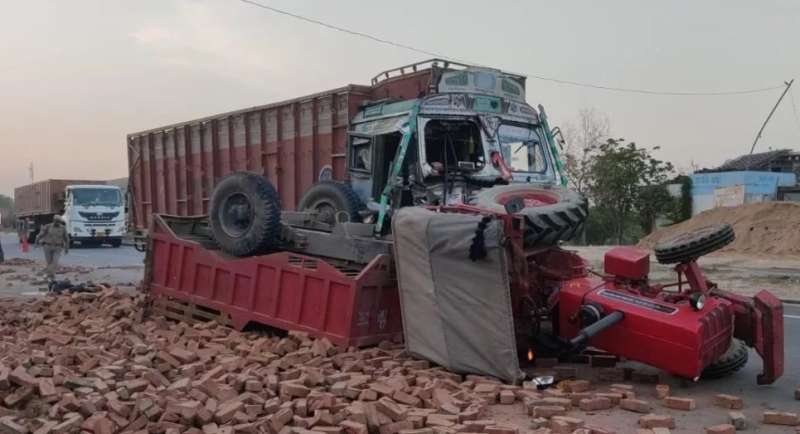 ट्रक ने ट्रैक्टर को मारी टक्कर, युवक फंसा नीचे, भीड़ ने पलट दिया ट्रक