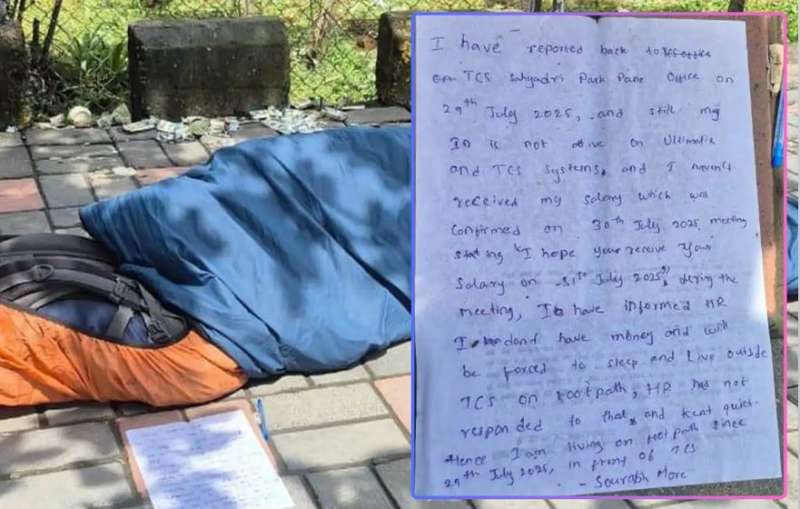 सौरभ ने आगे लिखा, 'मैंने एचआर को बताया है कि मेरे पास रुपये नहीं हैं। मुझे TCS के बाहर फुटपाथ पर सोने और रहने के लिए मजबूर होना पड़ रहा है।' टीसीएस के एचआर ने सौरभ के मामले में कोई जवाब नहीं दिया। सौरभ 29 जुलाई से TCS के सामने फुटपाथ पर रह रहे हैं। सौरभ ने बताया कि वह छुट्टी पर गए थे। लौटे तो उनके इंटरनल सिस्टम का एक्सेस ब्लॉक कर दिया गया था। उनकी सैलरी रोक दी गई। वह अब सड़क पर आ गए हैं।