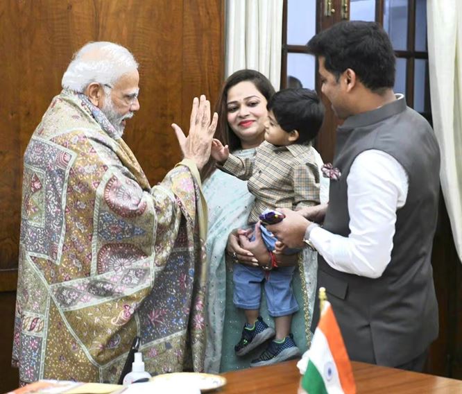 एकनाथ शिंदे जी ने पीएम मोदी को बताया कि रुद्रांश घर पर खेल रहा है। उन्होंने कहा कि रुद्रांश की एक डिमांड की है। उसने कहा है कि उसके दादा मोदी बाबा से फाइटर प्लेन और खिलौने लाएं। यह सुनकर प्रधानमंत्री मोदी खूब हंसे।