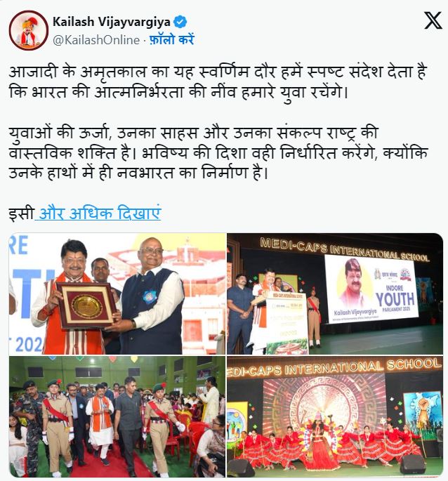 इंदौर के एक निजी स्कूल में आयोजित युवा संसद कार्यक्रम में मंत्री कैलाश विजयवर्गीय ने युवाओं से स्वदेशी खानपान अपनाने की अपील की। उन्होंने कहा - “भारत की युवा आबादी पूरी अमेरिका की जनसंख्या के बराबर है। अगर युवा ठान लें तो अमेरिका को झुका सकते हैं।” उन्होंने मज़ाकिया अंदाज में ट्रंप को ‘फूफा’ कहकर संबोधित किया और कहा कि भारत आत्मनिर्भरता से ही अमेरिका को जवाब देगा।