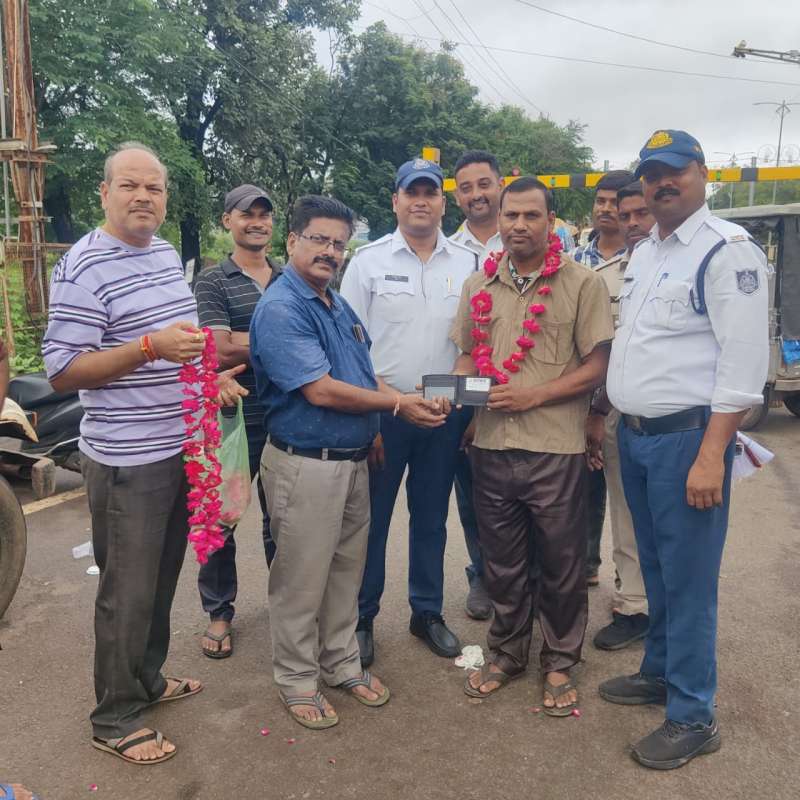 एमपी 33 आर.1379 मे छूट गया था। तभी ऑटो के चालक सुरेन्द्र राठौर पुत्र सरवन राठौर उम्र 47 साल निवासी तुलसी नगर ने ऑटो में मिले पर्स व अन्य दस्तावेजों को संबंधित को सौंपने के लिए उनके मो नं 7879208366 पर संपर्क किया और जानकारी देकर खोया हुआ पर्स संबंधित को यातायात विभाग अमले के समक्ष सौंपा गया। इस दौरान ऑटो चालक द्वारा ईमानदारी की मिसाल पेश करने पर शिक्षक मुकेश कुमार सक्सैना के द्वारा पर्स सुरक्षित मिलने पर उक्त ऑटो चालक का फूल माला पहनाकर सम्मानित किया गया और उसकी ईमानदारी को सराहा गया।