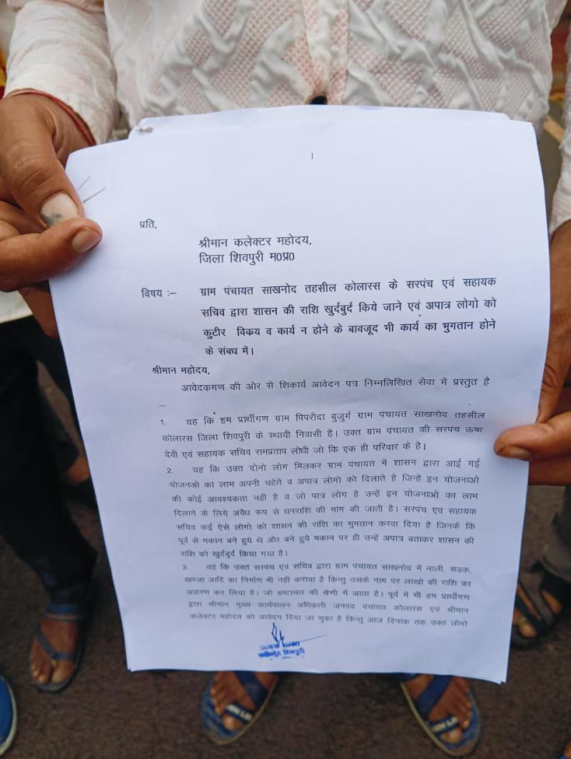 ग्राम पंचायत सायलोनद (तहसील कोलारस) में सरपंच एवं सहायक सचिव पर गंभीर आरोप लगाते हुए ग्रामीणों ने कलेक्टर शिवपुरी को ज्ञापन सौंपा है। ग्रामीणों का कहना है कि शासन द्वारा गरीब और जरूरतमंद परिवारों के लिए भेजी गई राशि का दुरुपयोग किया गया है।