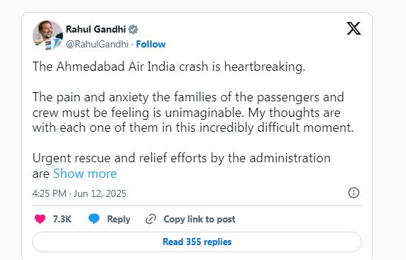 कांग्रेस सांसद राहुल गांधी ने दुख व्यक्त करते हुए कहा कि अहमदाबाद एयर इंडिया क्रैश दिल दहला देने वाला है. यात्रियों और चालक दल के परिवारों को दर्द और चिंता महसूस हो रही है कि यह अकल्पनीय है. मेरे विचार इस अविश्वसनीय रूप से कठिन क्षण में उनमें से हर एक के साथ हैं. प्रशासन द्वारा तत्काल बचाव और राहत के प्रयास महत्वपूर्ण हैं - हर जीवन मायने रखता है. उन्होंने कहा कि दुख की इस घड़ी में सभी कांग्रेस कार्यकर्ता एकसाथ हैं.